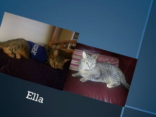 The document discusses the narrator's pets, which include a German Shepherd/Husky mix named Tana, and three cats named Paws, Tasha, and Ella. Tana is described as large but friendly. The cats have different personalities - Paws is loud, Tasha was the runt and brings gifts, and Ella is tabby colored and friends with Tana. In conclusion, the narrator enjoys their unique pets.