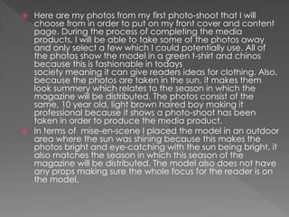 The document discusses photos taken for a magazine cover and content pages. It describes various shots taken - mid shots showing the upper body, long shots showing the full body, and close ups of the face. The photos were taken outdoors with the model wearing a green shirt and chinos. Two photos were selected for the cover and content page that capture the model's emotion to relate to an interview inside. The photos have a minimal background to focus on the model.