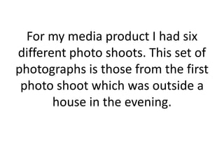 The document discusses a photographer selecting photos from multiple photo shoots for a media project. It provides details on 6 photo shoots with models in various settings. For each photo, the photographer comments on whether they will use the photo and why or why not based on factors like lighting, eye contact, background elements, and image quality. In the end, the photographer chooses some final photos that will work best to portray the "indie" and "rock and roll" image they want based on the model's pose and expression and technical photo qualities.