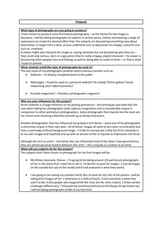 I will produce portraiture photography exploring themes of discovery. Subjects will pose with various expressions to depict discovering new aspects of themselves, ranging from depression to creativity. The photos could show viewers discovering peoples' lives and feelings. I will photograph my classmate Shania posing to represent being happy but sad inside and that not everyone is what they seem. I will also photograph my friend Alix posing for several images representing themes like being a child at heart and keeping things locked up. In post-production, I will dodge and burn photos, adjust levels and exposure, blur backgrounds, and modify contrasts and colors. When shooting, I will use a central vantage point, consistent camera settings depending on lighting, low key lighting with