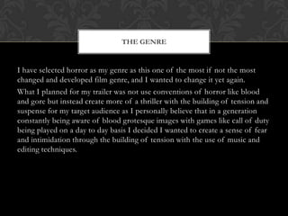 Jack Jackson proposes a horror film trailer that builds tension and suspense through psychological elements rather than graphic violence. He will use themes of tension, isolation, and the unknown relating to the Gothic tradition. The protagonist Jack will be pursued by the spirits of the forest as the antagonists. Jackson aims to create fear in the audience through tension and suspse rather than attractive victims or everyday props. Diegetic and non-diegetic music will be used to build climax. Shots like close-ups, panning and point-of-view will engage the audience in the protagonist's experience without revealing too much of the plot.
