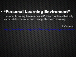The document discusses Edgar Mena's personal learning environment (PLE). His PLE includes social media and online tools that help him manage and take control of his own learning, including improving his English skills. He uses Facebook to communicate and share information with people around the world. Twitter allows him to follow accounts and get breaking news quickly in under 140 words. Gmail provides tools to share documents across networks. YouTube is used to watch tutorial videos to learn about interests and find new music. TuneIn finds radio stations worldwide. Blogger is used to share views and receive others'. ZUNAL expresses knowledge and how to teach others.