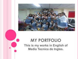 This document outlines the author's portfolio which includes works in English from their Media Tecnica de Ingles class covering topics such as taking care of the planet, an accident, their experiences, daily routine, works, academic development, pet, family, foods like pizzas and salads, and Valentine's Day. The portfolio also mentions other works by the author.