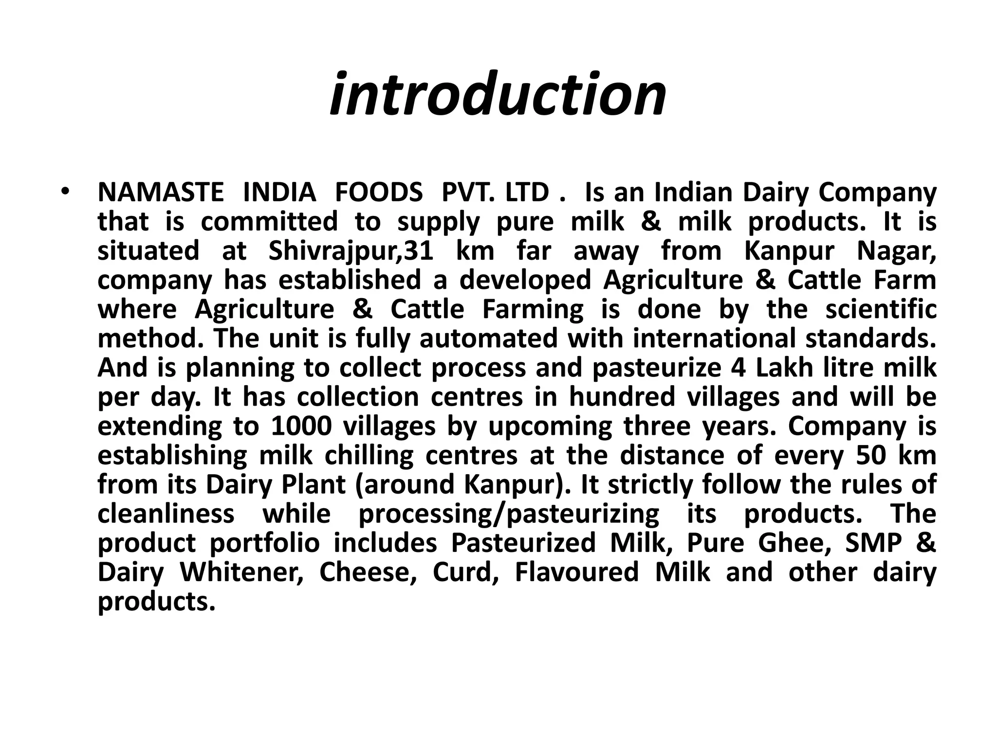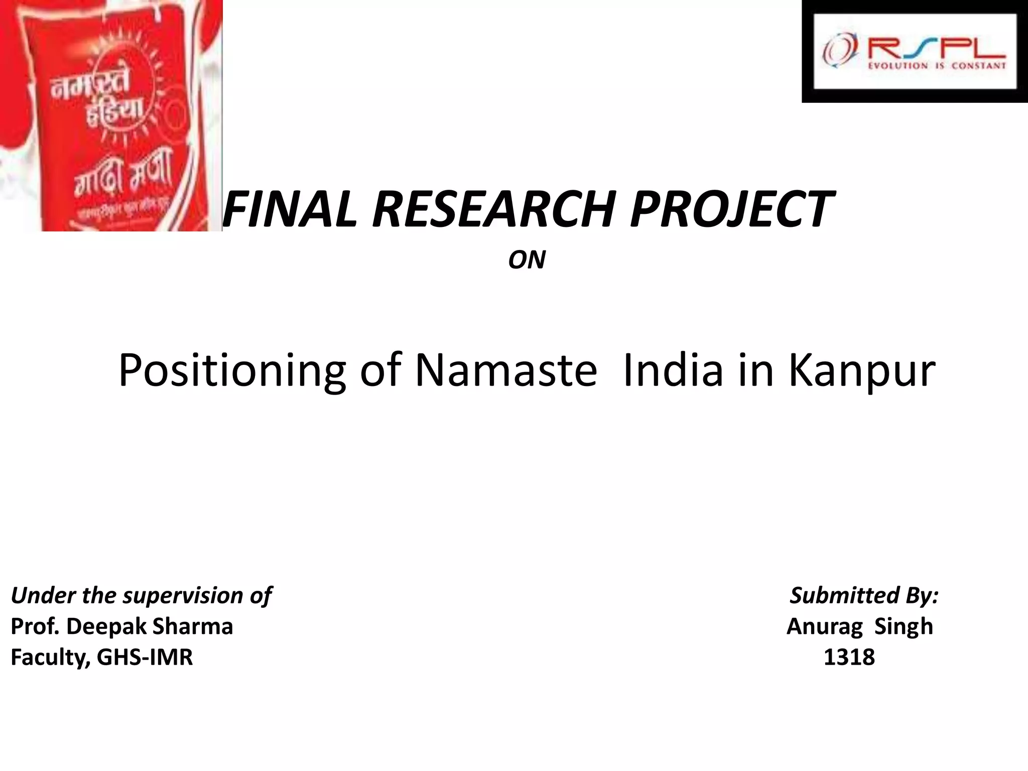 Namaste India Foods is an Indian dairy company that operates a farm and processing plant near Kanpur. It collects milk from local villages and tests quality extensively before processing and pasteurizing products. The research project surveyed 100 Kanpur consumers to understand the competitive milk market. Most consumers purchased Amul for its high quality. While Namaste India is new, many consumers were open to home delivery and saw its quality as fair. The research can help Namaste India understand its brand positioning and identify ways to improve quality perceptions.