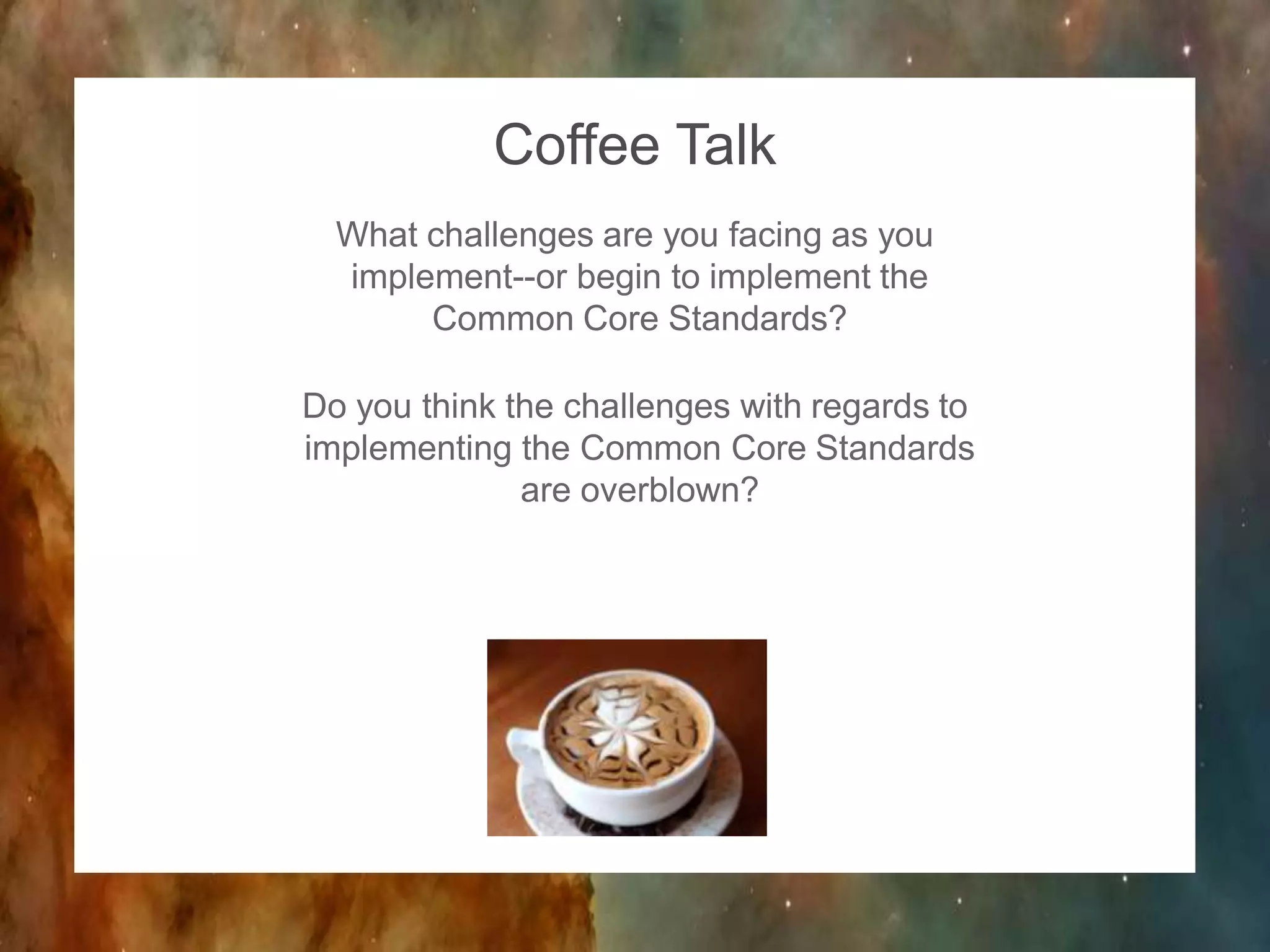 Teachers discussed challenges with implementing the Common Core Standards and whether those challenges are overblown. Some teachers expressed difficulties with transitioning to the new standards while others felt the challenges were not as significant as portrayed. Most agreed more support is needed but the standards aim to better prepare students.