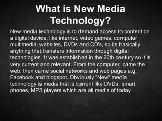 New media technologies used included YouTube for analyzing films, tutorials, and uploading the finished film. Social media platforms like Twitter and Facebook were used to promote the film and communicate. Blogger was used for group and individual blogs to upload work and evaluations. Other technologies included a HD video camera and DSLR camera for filming, a MacBook Pro for work, Final Cut Pro for editing, USBs for file storage, Photoshop for ancillary tasks, and PowerPoint for presentations.