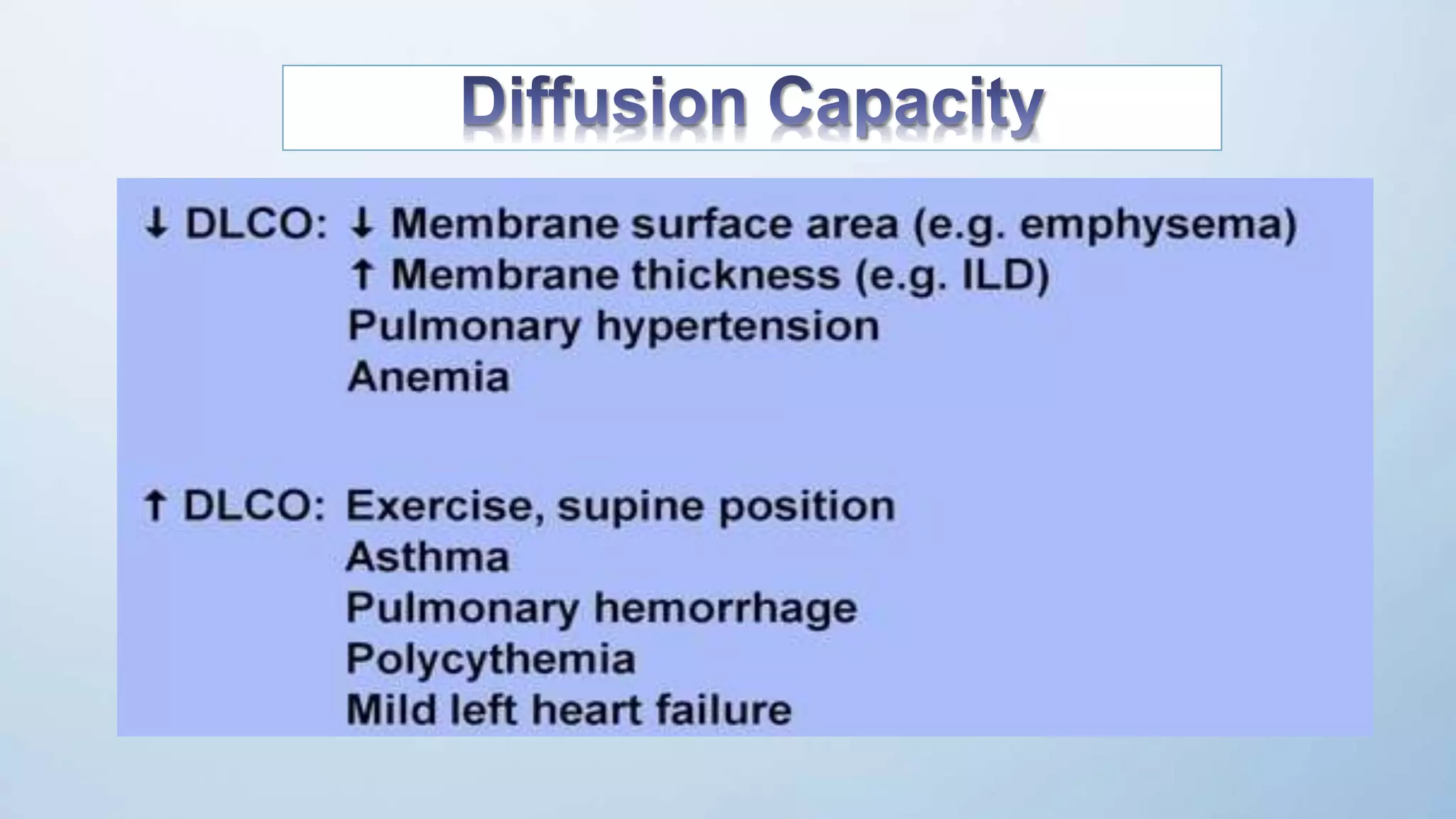 2. Spirometry assesses airway obstruction but has limited PPC prediction value. Restrictive patterns on lung volumes indicate reduced lung size. Diffusion capacity reflects lung membrane integrity.