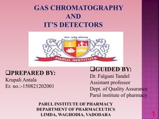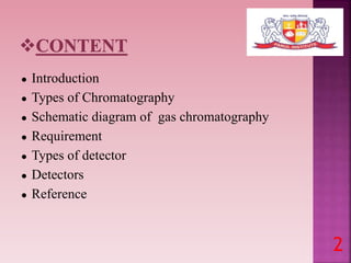 This document discusses gas chromatography and its detectors. It begins by explaining that gas chromatography is a separation technique that uses a mobile gas phase and a stationary liquid or solid phase. The mobile phase is a carrier gas and the stationary phase can be solid or liquid coated on a support. It then describes different types of gas chromatography based on the stationary phase used. The document outlines the basic components and process of gas chromatography. It discusses the different types of detectors used in gas chromatography including thermal conductivity, flame ionization, flame photometric, electron capture, photoionization and others. It provides details on the principles and applications of each detector type.