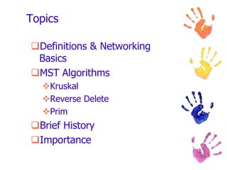 The document discusses minimum spanning trees (MSTs) and MST algorithms. It defines key graph theory terms like nodes, edges, paths, and spanning trees. It then explains three common MST algorithms - Kruskal's algorithm, reverse delete algorithm, and Prim's algorithm - and provides examples of how each works. Finally, it discusses the importance of MSTs, noting they are used to find shortest routes in networks and prevent loops in computer networks.