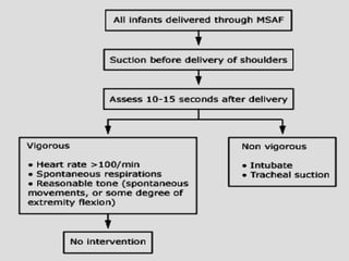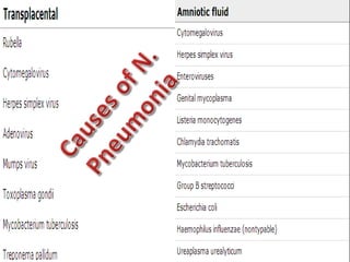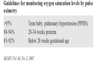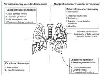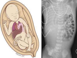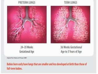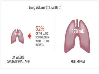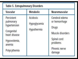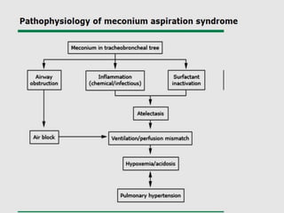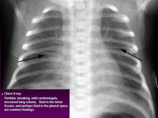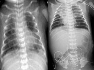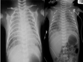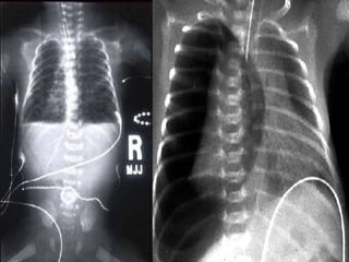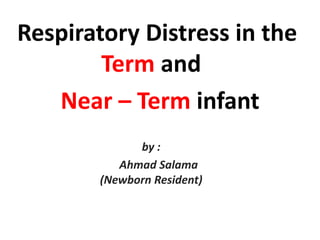 This document discusses respiratory distress in term and near-term infants. It outlines several common causes of respiratory distress including transient tachypnea of the newborn (TTN), respiratory distress syndrome (RDS), meconium aspiration syndrome (MAS), pneumonia, congenital diaphragmatic hernia (CDH), pulmonary air leak syndromes, and persistent pulmonary hypertension of the newborn (PPHN). For each cause, it describes risk factors, clinical presentation, pathophysiology, diagnosis, and management. The goal of management is to support oxygenation and ventilation while minimizing lung injury until the underlying condition resolves.