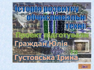 Лічильні пристрої допояви ЕОМ Ще за часів найдавніших культур людині доводилося розв'язувати задачі, пов'язані з торговельними розрахунками, з обчисленням часу, із визначенням площі земельних ділянок тощо. Зростання обсягів цих розрахунків призводило навіть до того, що з однієї країни до іншої запрошували спеціально навчених людей, які добре володіли технікою арифметичного числення. Тому рано чи пізно мали з'явитися пристрої, що полегшують виконання повсякденних розрахунків. Так у Давній Греції й у Давньому Римі були створені пристрої для лічби, названі абак (від грецького слова abakion - «дощечка, покрита пилюкою»). Абак називають також римською рахівницею (латиною - abacus ). Це були кістяні, кам'яні чи бронзові дошки із заглибленнями-смугами, у яких містилися кісточки (або камені). Лічба здійснювалася пересуванням кісточок. Назад Дал і