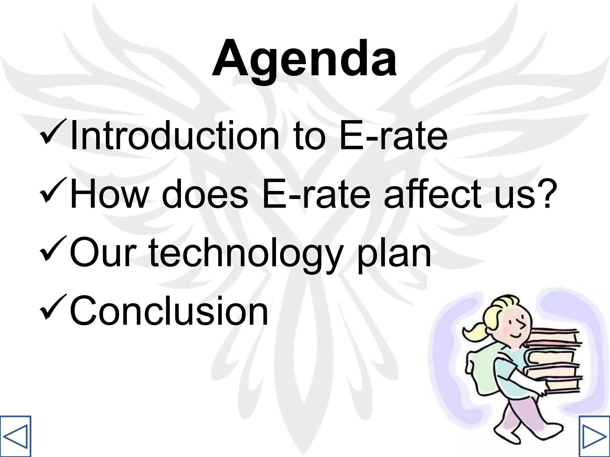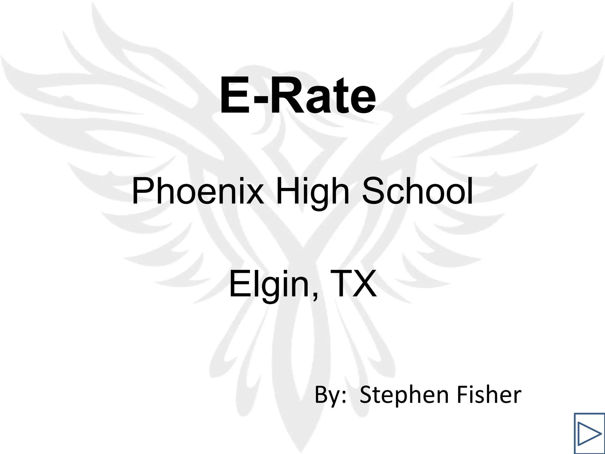 This document discusses how E-Rate, a program that provides discounts for internet access and telecom services for schools and libraries, affects Phoenix High School in Elgin, TX. It summarizes that the school received an 82% discount this year and saw positive results in its STaR technology assessment scores over the past few years. The technology plan goals are outlined as educating students with curriculum-integrated technology, supporting infrastructure, providing administration and support, and establishing a technology committee. The conclusion is that the school has seen a positive trend in leadership/support and teaching/learning through improved scores, with all areas now at an advanced technology level after recovering from poor initial scores.