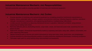 The document discusses the responsibilities and duties of an industrial maintenance mechanic. It describes key duties such as ensuring machinery operation through preventative maintenance, locating problems, removing defective parts, adjusting parts, and more. It also lists important skills like equipment maintenance, technical understanding, safety compliance, and attention to detail. The job requires maintaining inventories, resources, and knowledge while contributing to team efforts and safety.