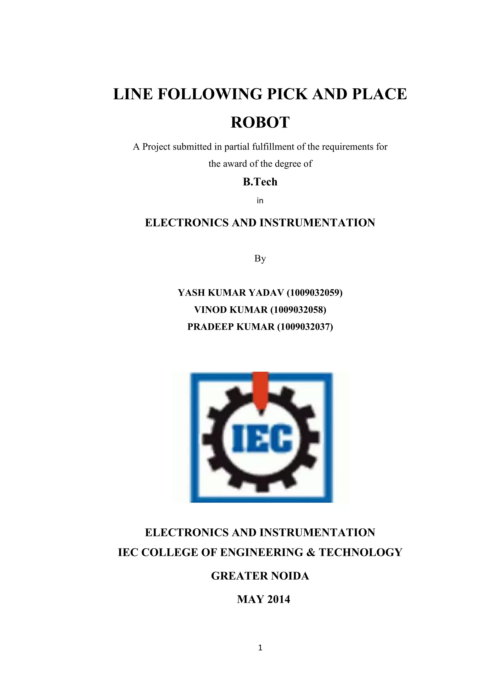 The document is a project report on the design of a line-following pick and place robot, submitted for B.Tech in Electronics and Instrumentation. It discusses the robot's capability to follow paths and perform pick-and-place tasks in industrial settings, highlighting its potential applications in automating processes. The project also outlines the hardware and software components involved, including the use of a microcontroller and various sensors.