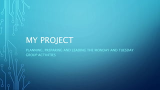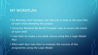 The document summarizes a 6-week program led by the author for children attending a community project on Mondays and Tuesdays. The program focused on social skills development for the first 3 weeks and emotional development for the last 3 weeks. A variety of activities were planned each week like gingerbread decorating, group games, parachute games, and art projects. Evaluations found the children engaged well and their social and emotional skills improved over the course of the program. The author felt it was a valuable learning experience.