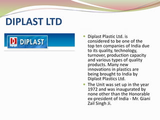This document discusses Nasir Azmi's responsibilities as an assistant supervisor of injection molding machines at Diplast Ltd. It provides an overview of injection molding, describing the basic parts and systems of injection molding machines. It also outlines Nasir's duties, which include minimizing scrap, ensuring quality, optimizing labor, and reducing mold change times. The document discusses applications of injection molding and provides information on common plastics used in the process like PVC.