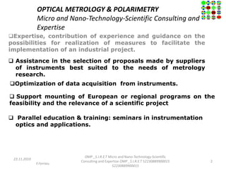 This document provides information on optical metrology and polarimetry consulting services. The consulting services include: