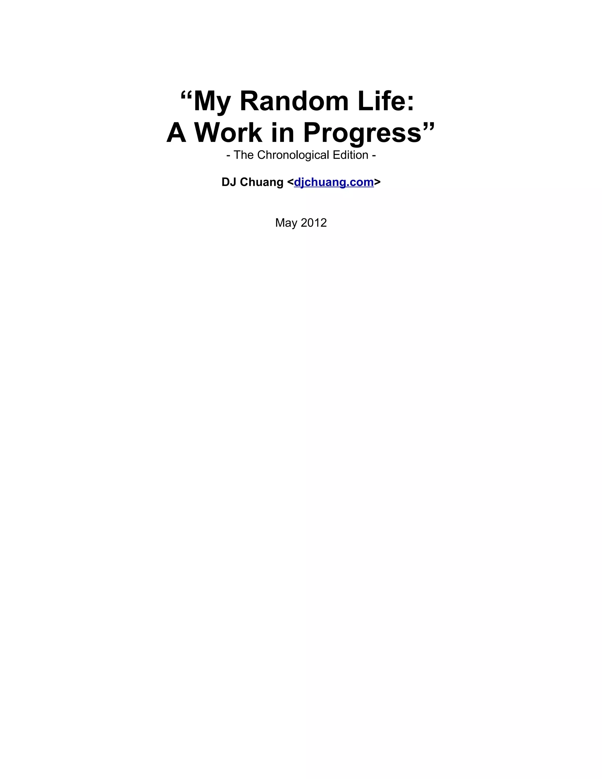 The document is a compilation of personal journal entries by DJ Chuang reflecting on his life’s journey, struggles, and learnings as an Asian American. The author aims to provide an honest account of his experiences, including battles with shame, vulnerability, mental health, and the search for identity, while offering hope to others facing similar challenges. He encourages feedback on his writings as he works toward an extended edition that will include commentary alongside the blog posts.