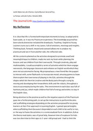 This document is a reflection from a student teacher, Analia Orelia, on her practicum experience teaching English to 3-year-olds at a preschool in General Pico, La Pampa, Argentina. She planned lessons incorporating creativity, play, and multimodal activities to engage the children in a new English world. While the short exposure time was a challenge, observing the children helped her scaffold instruction. This meaningful experience helped her develop a teaching identity and better understand how to teach very young learners through contextualized activities. Overall, the practicum was a valuable journey that will help guide her teaching career by reflecting on strengths and weaknesses.