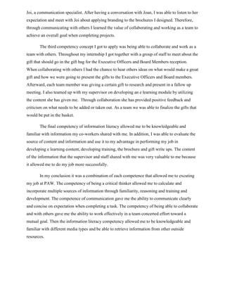 As an example, Mitchell used critical thinking to find pictures of company executives for a brochure by listening to needs and drawing conclusions. He communicated effectively with others to understand expectations and collaborate on projects like developing training materials. Working as a team, Mitchell researched gift options for an executive reception. Information literacy allowed him to evaluate shared content and perform tasks like creating e-learning modules. In conclusion, each competence helped Mitchell successfully perform his internship duties