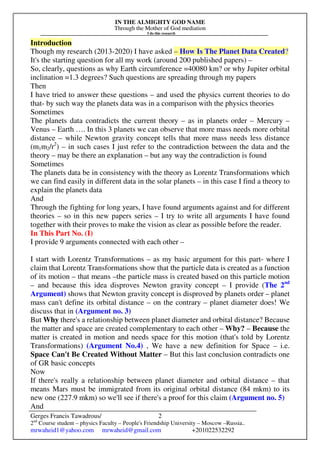 Gerges Francis Tawadrous investigates the creation of planetary data through nine interconnected arguments, highlighting the inconsistencies in current physics theories, particularly Newton's gravity. He posits that the Lorentz transformations demonstrate how particle properties, including mass, are functions of motion and that planet diameters are more crucial than mass in determining orbital distances. Ultimately, the research argues for a geometric relationship between matter and space, positing that both are created simultaneously and are interdependent.