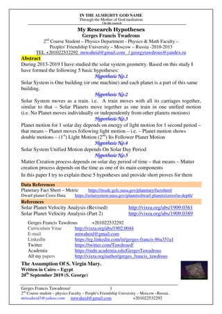 Gerges Francis Tawadrous presents five hypotheses regarding the solar system's geometry, proposing that planets function as parts of a unified machine and that their motions are interdependent. Through a series of examples and mathematical relationships, he argues that planetary movements and properties are interconnected, pointing to the need for a deeper geometrical understanding of these relationships. The document emphasizes the importance of analyzing planetary data to support his claims, reflecting a unique perspective on astrophysics.