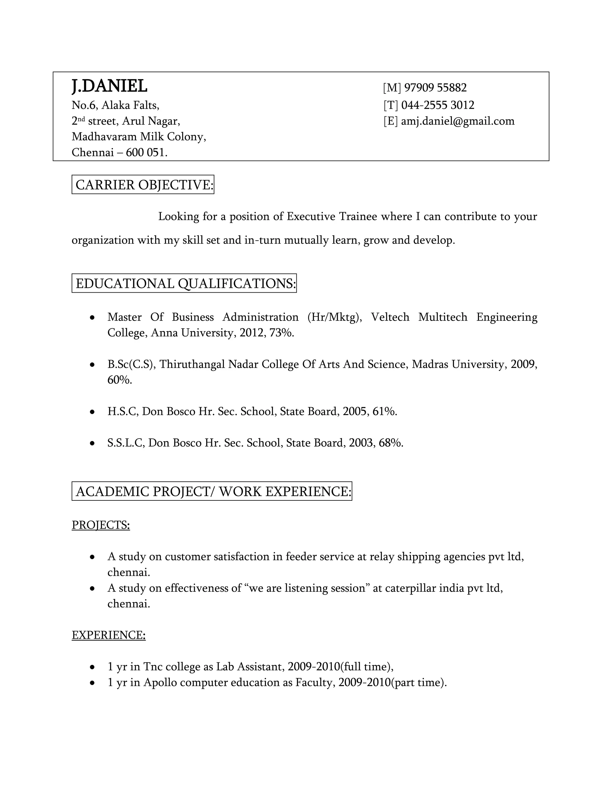 J. Daniel is seeking an executive trainee position where he can contribute his skills and experience. He has a Master's degree in HR/Marketing and Bachelor's in Computer Science. He has experience as a lab assistant and faculty member. His skills include effective communication, team building, MS Office, programming languages, and networking. He was captain of NSS and organized events, participated in competitions and cultural programs. His hobbies include interior decoration, gardening, pets and cooking. He is fluent in English, Tamil, Hindi and Malayalam.
