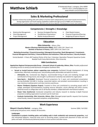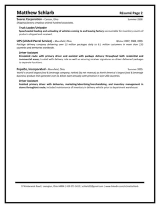 Matthew Schlarb is a sales and marketing professional with strong relationship building and multi-tasking skills. He has an MBA from Ohio University and experience providing consulting services to small businesses through an entrepreneurship group. His work experience includes roles in landscaping, shipping, package delivery, and food and beverage distribution where he assisted drivers and helped manage inventory. He is looking to leverage his education and well-rounded work background into a sales or marketing position.