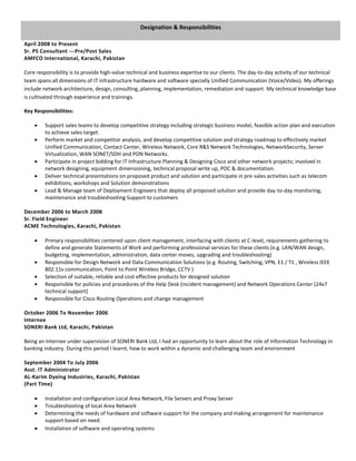 This document is a resume for Faheem Iqbal Ansari. It summarizes his objective to utilize his technical, management, and interpersonal skills in the field of information technology. It then lists his professional experience implementing IT infrastructure solutions including unified communications, contact centers, networking, security, and Microsoft/Cisco integration projects for various organizations in Pakistan. His technical skills and professional certifications from Cisco, Juniper, Microsoft, and other vendors are also outlined.