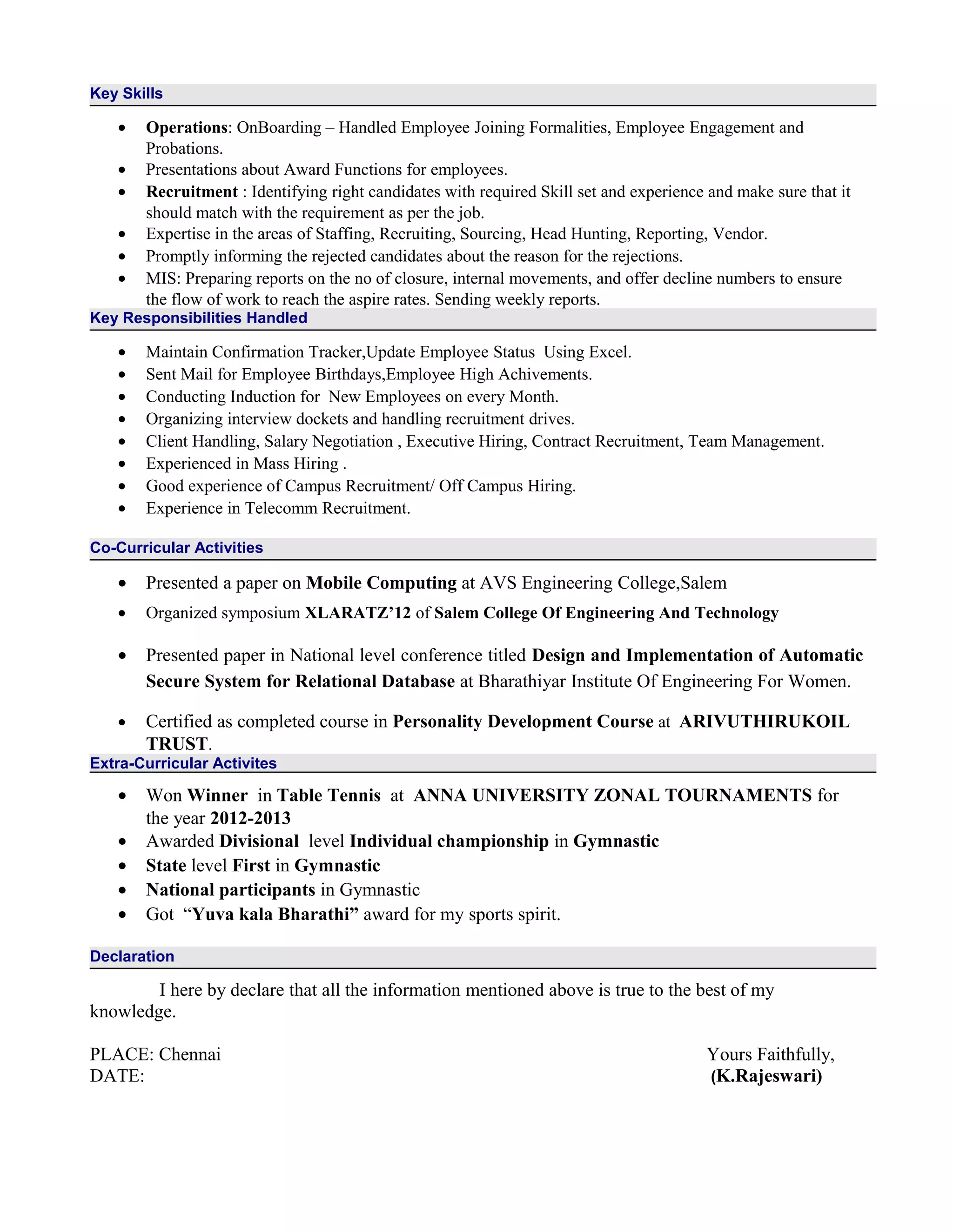 Rajeswari is seeking a position in human resources. She has over 1 year of experience as an HR executive at Idea Cellular in Chennai. She holds an MBA in HR from the University of Madras and a BE in computer science from Salem College of Engineering and Technology. Her skills include recruitment, onboarding, employee engagement, and reporting. She is proficient in staffing, sourcing, interviewing, and campus recruitment.