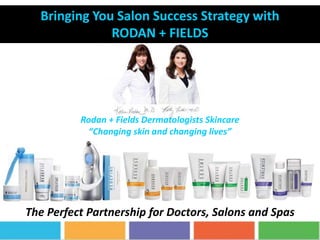 This document describes a partnership opportunity between salons/spas and Rodan + Fields, a skincare company founded by dermatologists Dr. Katie Rodan and Dr. Kathy Fields. It highlights how adding Rodan + Fields products and services can benefit salons by bringing in new customers and residual income. The document provides information on Rodan + Fields' product lines, money-back guarantee, customer support services, and the credentials and experience of Dr. Rodan and Dr. Fields to establish their expertise and trustworthiness. Sample marketing materials are also included to promote Rodan + Fields to existing salon customers.