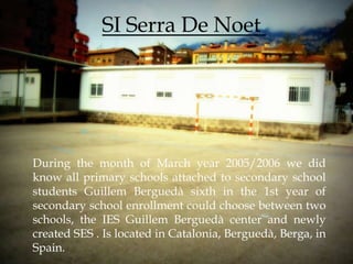 The document summarizes the opening of a new secondary school, SES Yard, in Catalonia, Spain in March 2005/2006. Students from primary schools could choose between the existing IES Guillem Berguedà center or the newly created SES Yard. In the beginning, SES Yard was still under construction and only had one building completed. By September 12, classes started and more facilities like a computer room and sports courts were added by late September and February. The local city council and IES Guillem Berguedà helped prepare the new school for its opening in the summer of 2005.