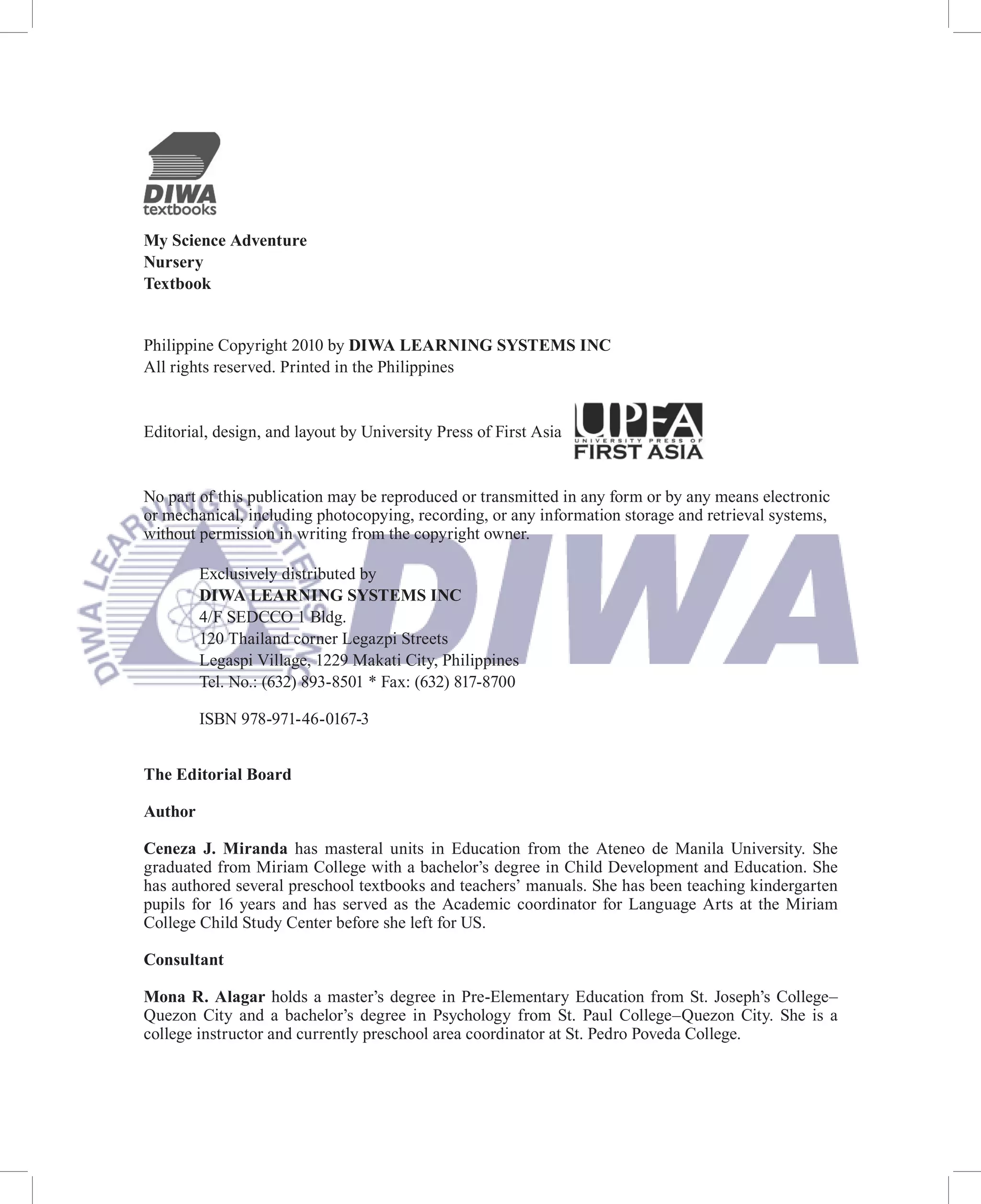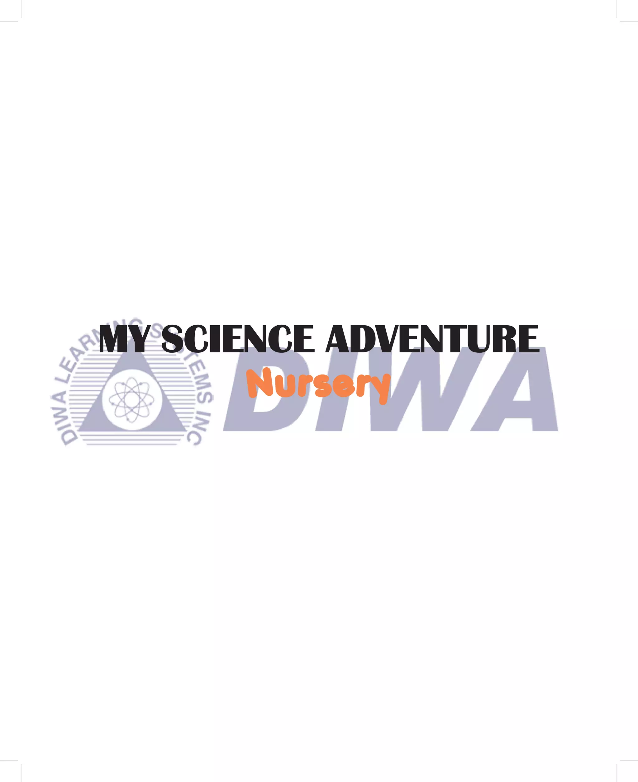 This document is a nursery science textbook titled 'My Science Adventure,' published by Diwa Learning Systems, Inc., aimed at young learners in the Philippines. It focuses on helping children discover science through experiential learning, with sections covering topics such as the human body, plants and animals, everyday objects, and the environment. The book encourages questions and parental involvement to enhance the learning experience and includes various activities for interactive participation.