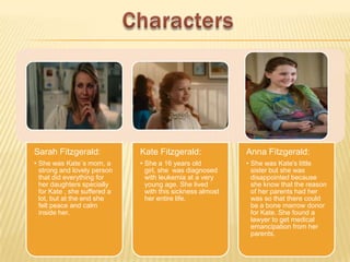 Kate was diagnosed with leukemia at a young age and needed frequent bone marrow donations from her sister Anna to survive. Anna sued her parents for medical emancipation to avoid further donations. Her lawyer Alexander Campbell took the case to gain publicity. As Kate's health declined, she convinced Anna to stop fighting. Kate later confessed the truth to her mother and passed away, bringing the family closer together before losing an important member.