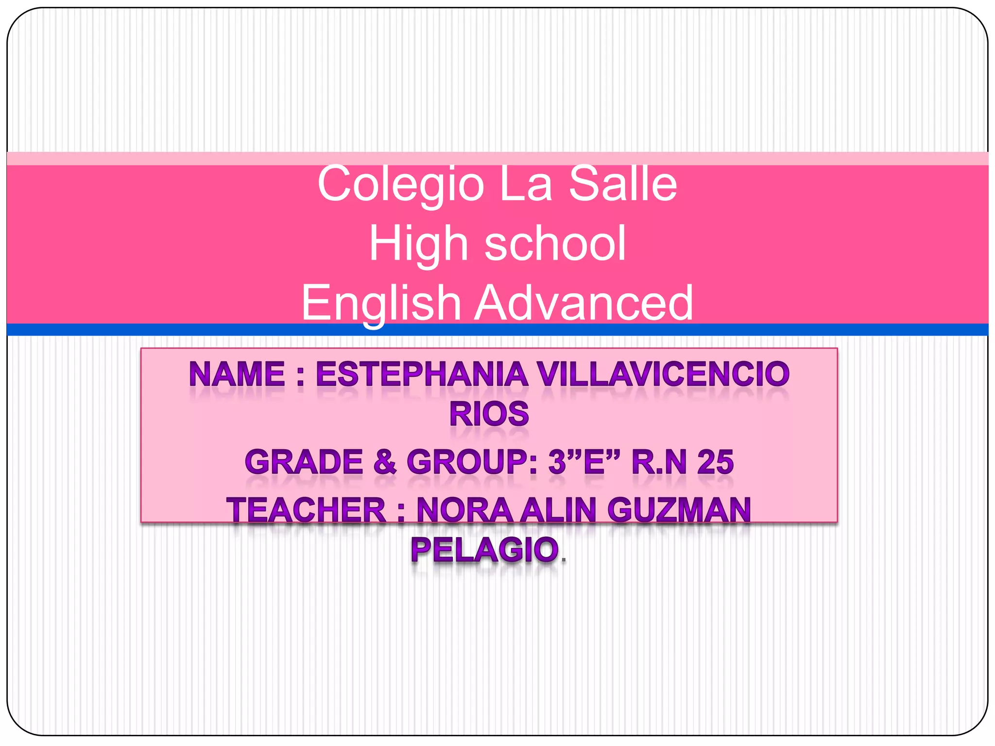 This document contains information about a student named Estephania Villavicencio Rios who is in the 3rd grade, group E, with a registration number of 25. Her teacher's name is Nora Alin Guzman Pelagio and she attends Colegio La Salle High School for an English Advanced class. The document mentions characters, settings, and timeline but provides no further details about them or a movie.