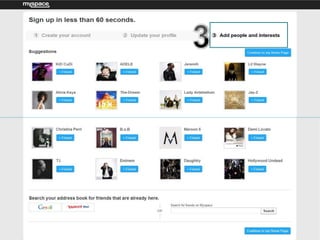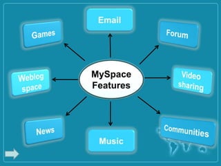 This document provides an overview of the social networking site MySpace, including its history, features, and how to create an account. MySpace was founded in 2003 and allows users to communicate with friends, customize profiles, post comments, blog, and keep in touch with others. While sign up is free and easy within 60 seconds, there are disadvantages like privacy/security issues, fake profiles, and potential stalkers. In conclusion, MySpace offers various communication and sharing tools to connect with others from around the world for free.