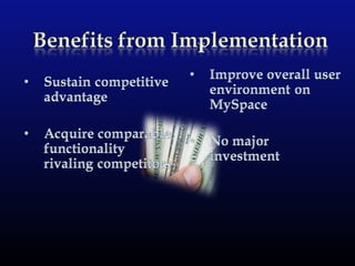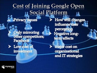 The document discusses recommendations for MySpace regarding Google's Open Social platform. It suggests that MySpace should not enter into the Open Social platform for three key reasons: 1) It could compromise customer privacy by sharing personal data. 2) It would strip MySpace of its differentiation by making it similar to competitors. 3) It would be difficult to develop innovative, own-branded products on a shared platform rather than a proprietary one. The document advocates for MySpace creating its own functional platform to stay true to its organizational and IT commitments.