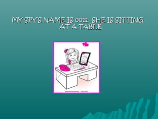 A girl named Abril Climente Vivó created a project about her spy named 0011. The spy is sitting at a table wearing a blue coat, red hat and pink glasses. She is crossing her legs and writing a coded message on her mobile phone with her camera. The spy is saying "Hello!" and scratching her hands but is not standing up, wearing gold jeans and a purple hat or folding her arms.