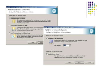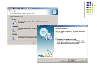 Windows 平台下的安装 进入MySQL 欢迎界面,选择“ Setup Type” ,选择安装类型和安装路径,选择是否“ configure the MySQL Server now” 。