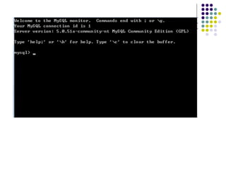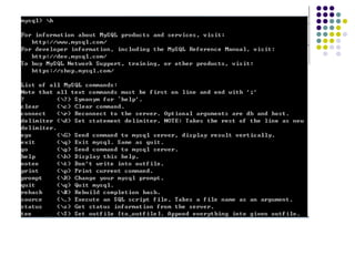 在欢迎界面中介绍了以下几部分内容: 命令行结束符,用;或者 \g 结束; 客户端连接 id :记录 mysql 服务到目前为止的连接次数;如上例是 1 ; Mysql 服务器的版本:本例中是“ 5.0.51a-community-nt edition” ; 通过“ help;” 或者“ \h” 命令来显示帮助内容,通过“ \c” 命令来清除命令行。