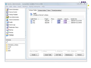 1 ) MySQL Administrator MySQL Administrator 是 MySQL 为 4.0 以上版本数据库提供的可视化界面的 mysql 数据库管理控制台,可以方便地管理和操作 mysql 数据库; 提供的功能包括启动关闭数据库、用户管理、参数配置、数据库对象管理、备份恢复管理等。