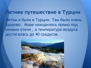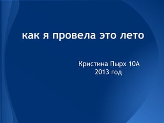 Кристина Пырх описывает свое лето 2013 года, проведенное в Турции и Эстонии. Она работала в магазине и проводила свободное время с друзьями, наслаждаясь прогулками и поездками на море. Кристина считает это лето самым лучшим в своей жизни.