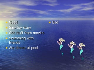 The document describes a summer day that included watching Toy Story, going to the movies, swimming with friends, and eating dinner at a pool. However, the day was also marked by something bad occurring.