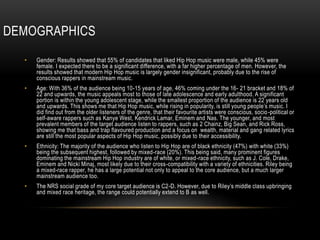 • Ethnicity: The majority of the audience who listen to Hip Hop are of black ethnicity (47%) with white (33%)