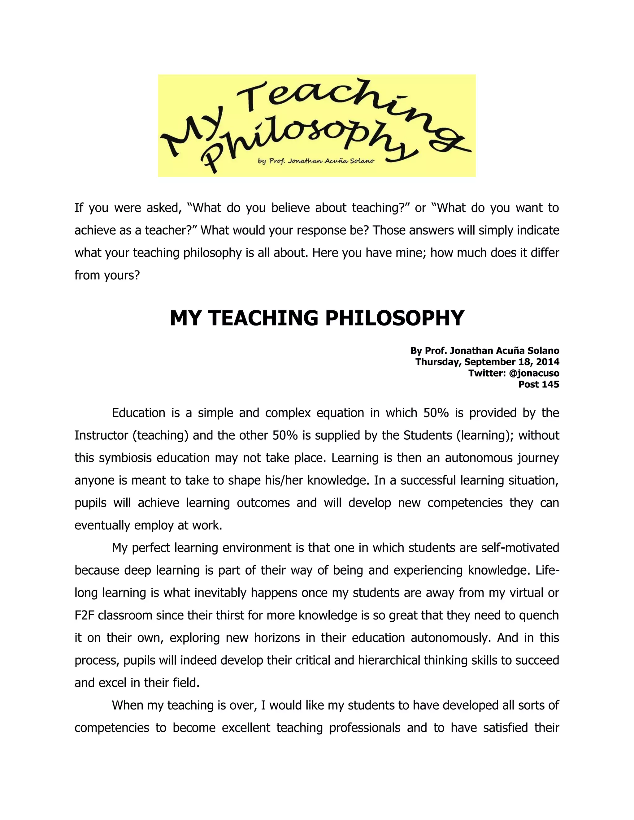 The document outlines a teaching philosophy that emphasizes student-centered learning and lifelong learning. It advocates for a 50-50 approach where teachers provide 50% of education through teaching and students provide 50% through learning. The ideal learning environment encourages self-motivated, autonomous students who develop critical thinking skills. The goal is for students to become excellent teaching professionals able to face challenges in education and benefit their own students. Project-based learning and communicative language teaching are advocated for developing skills and deep learning.