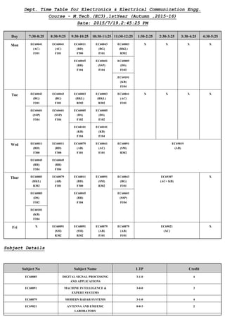 This document contains the time table for the M.Tech.(EC3) 1st year (Autumn 2015-16) course at the Department of Electronics & Electrical Communication Engineering. It lists the class schedule for each day of the week, including the course codes, names, locations and times. It also provides details of 12 subjects for the term, including their codes, names, LTP credits (Lecture-Tutorial-Practical hours and credits awarded).