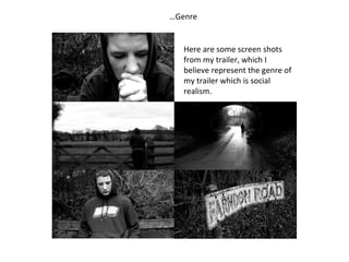 The document summarizes and analyzes screenshots from a trailer for a film about a teenage boy. The black and white shots and solemn expressions establish a serious, gloomy tone consistent with the genre of social realism. Intertitles provide just enough narrative context to intrigue audiences without revealing the full plot. The main character's costume accurately represents modern working-class youth while subverting stereotypes of aggression.