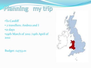 - Andrea and the author are traveling to Cardiff, Wales for 21 days from March 29 to April 19, 2012.