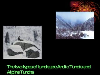 The document discusses the two types of tundra: Arctic and Alpine. Arctic tundra is a cold, treeless plain found around the Arctic Ocean, while alpine tundra occurs at high elevations rather than latitudes. Both are characterized by permafrost, or permanently frozen subsoil, which prevents tree growth. Common animals in tundra regions include Arctic foxes, wolves, and polar bears.