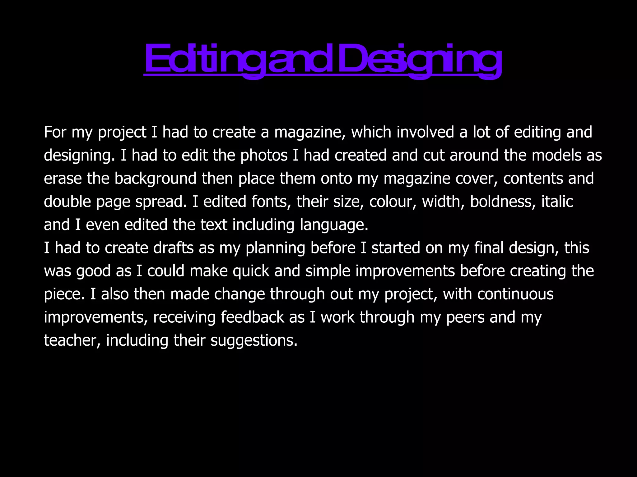The student created a magazine for a media coursework project that involved extensive editing and design work. This included editing photos by cutting out models and backgrounds, editing text fonts and layout, and making drafts and improvements based on feedback. The student used Macromedia Fireworks to create shapes and layers and Adobe Photoshop Elements to select and erase backgrounds. For the final project, the student made improvements such as changing to a black background for more realism, bolding the header font, and adding elements like a 3D circle to engage readers.